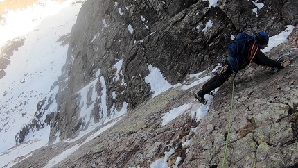 L5: Salire ancora 10 metri lungo il diedro fino ad incrociare una sottile cengia che permette di traversare l'intera placconata fino al margine destro, dove si riprende a salire su neve in direzione dell'evidente intaglio di uscita. Superare l'ultimo muretto uscendo sulla cresta affilata. Il traverso è protetto da tre chiodi: prima di cominciare il traverso, sulla sinistra della rigola, al centro del traverso (poco visibile) e in uscita dal traverso, prima di alzarsi su neve. È possibile attraversare più alti a ridosso degli strapiombi, ma la roccia è di scarsa qualità (S5 friend, 55m, M4, 3ch). Discesa
