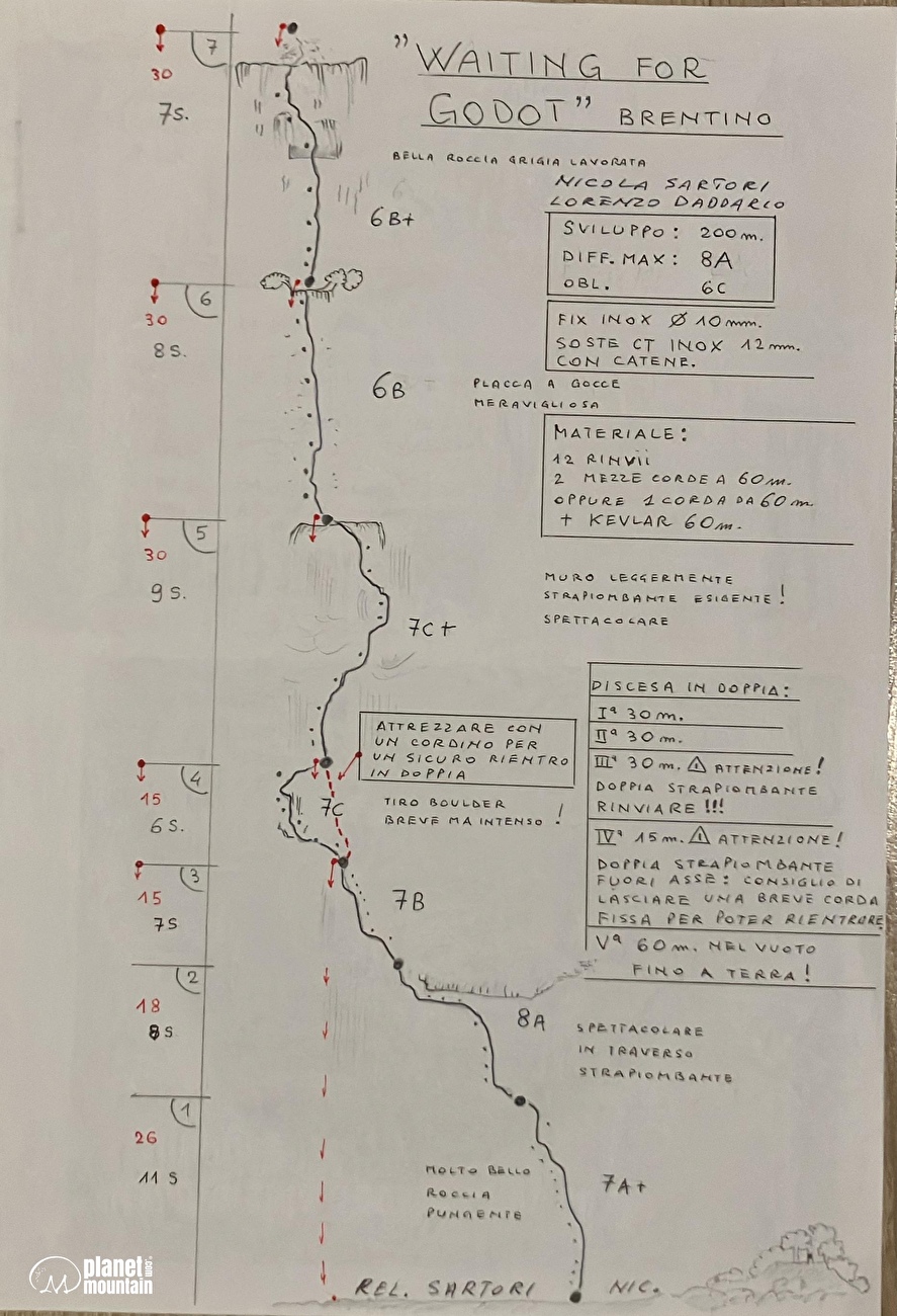 ItinerarioL1: 7a+, 26m, 11 spit. Molto bella, roccia pungente.