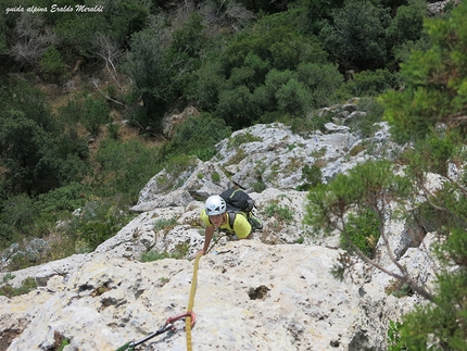 Lo spigolo perfetto dove corre forse la più bella linea di salita di III-IV grado di tutto il Mediterraneo. E’ raro trovare una via di questa difficoltà e di cosi piacevole e rilassante impegno, incastonata tra giardini alberati sospesi, palme...