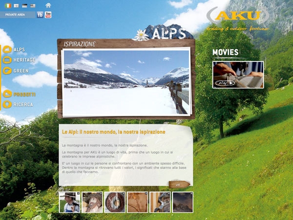 In questa nuova veste la sezione Products, dedicata alla consultazione della collezione, diventa un catalogo multimediale, in cui lutente può navigare soffermandosi su ogni particolarità del prodotto: dalle tecnologie applicate nella costruzione dello stesso ai partner storici come Gore Tex e Vibram. Durante la consultazione di alcuni modelli, compare un tasto che apre un video prodotto, in cui il Product manager AKU, Giulio Piccin, spiega il modello in tutte le sue caratteristiche tecniche. Questo innovativo catalogo interattivo consente al consumatore di cercare la sua scarpa ideale, a seconda dellutilizzo e delle necessità, e vuole dargli la possibilità di conoscere in maniera più approfondita il prodotto che intende acquistare, quali sono state le idee alla base del progetto, quali le tecnologie utilizzate nella costruzione della scarpa, e quali sono i range di utilizzo del prodotto.