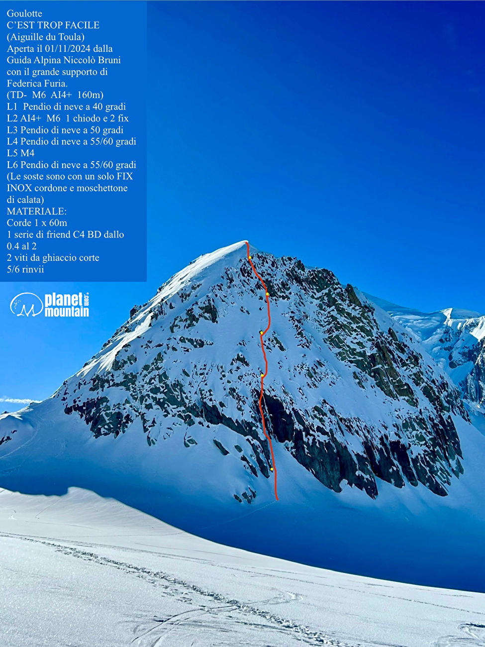 La relazione di 'C'est trop facile' all'Aiguille du Toula nel massiccio del Monte Bianco (Niccolò Bruni, Federica Furia 01/11/2024)