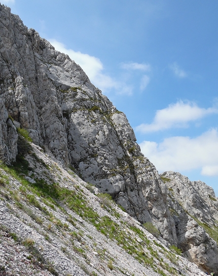 La roccia non bellissima, tipica del Terminillo, in un settore dei contrafforti rocciosi della valle, sotto la cresta della Vall’Organo, fa una piccola eccezione e lascia spazio ad un paio di fasce rocciose di ottimo calcare. Scoperta questa piccola particolarità nacque il 13/08/2012, in ricordo di un’amica, la via Ghita (linea 23; Pino Calandrella Francesco Chiaretti; svil. 75m, diff. V). E ancora il 05/10/2012, nacque la via Santiago di Campostella (linea 24; Pino Calandrella e Stefano Cascavilla; svil. 75m, diff. V).