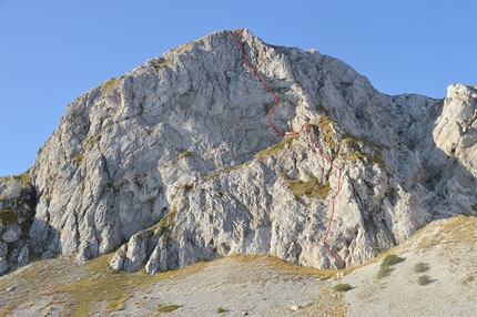Nel riprendere l’attività in una corsa solitaria in montagna mi imbattei nel Campanile appunto e con una triste associazione mentale il mio pensiero andò al Campanile di Accumoli (RI), che il 24 agosto 2016 aveva spazzato via un'intera giovane famiglia. Un evento questo, dolorosamente rappresentativo della tragedia che si era abbattuta, e si abbatterà successivamente, sul nostro caro Appennino centrale. Quel giorno non potei farne a meno, lo salii fino in vetta per una linea esposta, ma non difficile. Mi ripromisi di tornare per aprire una via di roccia e così fu. Ci tornai il 2 giugno 2017, con Fabio D’Adamo, con il quale aprimmo una logica, anche se breve, via di salita, su roccia discreta in basso e un po’ più delicata nella parte alta, e che oggi vanta diverse ripetizioni. La chiamammo via Diretta al Campanile (linea 26; Pino Calandrella e Fabio D’Adamo; svil. 95m, 2L, diff. V+) e la dedicammo agli amici e conterranei per i quali, nell’orribile 2016, i "Campanili" rappresentarono nel dolore, la storia dell'Appennino Centrale.