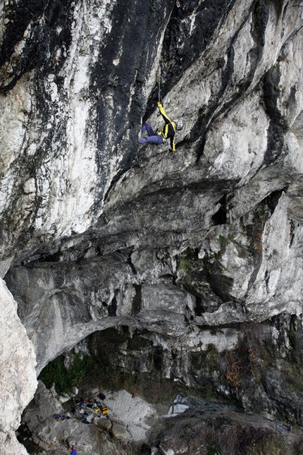 È Matteo che ha portato me e Mauro Rizzi, forte scalatore conosciuto dai tempi dell’Alpin Cup a provare la sua via a fine dicembre. Dopo l’ombra della grotta Cadorese, qui mi fa sudare il caldo del sole e i primi giri tra natale e capodanno li faccio in canottiera. Mauro riesce a chiudere la via in giornata, sua quindi la prima libera senza speroni, a me invece esplodono gli avambracci dai mille Yaniro consecutivi. Anche questa via, rimasta sospesa durante il periodo di Coppa del Mondo ma mai dimenticata, mi ronza per la testa, e motivata dal successo della mia prima libera nel Cadore torno a Brescia. Dopo mesi di allenamento con le piccozze mi sento molto bene e riesco, nonostante un attimo di incertezza a causa di un rinvio mancante, che due volte di fila mi dimentico di portare dietro, ad arrivare in catena.