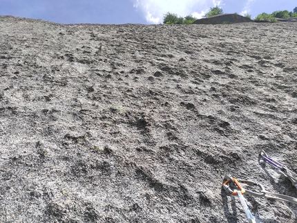 La curiosità di percorrere vie dimenticate su strutture un po’ fuori mano ci ha portato alle placche alte della Val del Ferro, una valle laterale della Val di Mello. L’avvicinamento alla parete, abbastanza avventuroso, attraversando torrenti e passando sotto una spettacolare cascata permette di raggiungere la parete in circa un’ora.