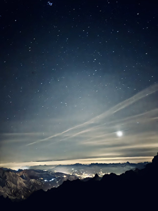 I tiri impegnativi mi hanno costretto a essere efficiente, ma soprattutto ad accettare la lentezza, a immergermi completamente. Alla fine, ho fatto quattro bivacchi in parete, incluso il primo su una piccola cengia di neve dura sospesa, legato con delle fettucce per non scivolare nel vuoto.
