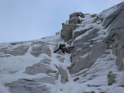 La mattina successiva ripartiamo e decido di non uscire dal diedro ma di provare a traversare verso sinistra. La neve sulla parete “snice” sembra essere abbastanza compatta. Faccio una sosta intermedia spezzando il tiro sotto il secondo strapiombo e recupero Roby (L7). Riparto (L8) e allungo la protezione sul dado che ha tenuto il volo la sera prima e con dei movimenti di misto riesco a superare lo spigolo per portarmi su neve migliore. I movimenti sono delicati per arrivare alla fessura in alto dietro lo spigolo dove riesco a proteggere bene ed a piazzare una bella sosta a friend. Il nono tiro non è difficilissimo ma continua ad essere in un ambiente decisamente delicato. Rischio un volo molto brutto per il distacco di una placca di ghiaccio. Poco più sopra riesco a piazzare una sosta e recupero il sacco con il cordino ausiliario. Qui Roby mi dà il cambio. Effettua un tiro molto bello (L10) che porta in direzione di una placca rocciosa verticale con neve troppo soffice per essere scalata. Devia a destra su una goulotte di ghiaccio molto buono e fa sosta sotto un altro strapiombo. Questa sorta di masso gigante che ci sbarra la strada è l'undicesimo tiro (L11).