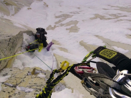 Roby prova prima a salire verso destra, libera la base del risalto dalla neve polverosa. A destra però la fessura che solca il masso è troppo stretta. Prova a sinistra e piazza un primo friend rosso a cui si appende cominciando a salire in artificiale usando delle fettucce in Dynema che ci ha fornito Salewa. La progressione è forzatamente lenta, nevica e già da un po' sono cominciate a scendere le prime slavine dall'alto. Dopo un po' piazza una piccozza nella fessura e due friend contrapposti ad una lama staccata e con un movimento molto duro scavalca lo strapiombo con uno spostamento verso destra. Continua a traversare per uscire dietro uno spigolo. L'eccessiva neve lo costringe ad un lavoro esagerato per preparare una sosta degna di questo nome. Il tiro successivo (L11) non è difficile ma è impossibile da proteggere. Dopo 15/20 m non riesce ancora a mettere nulla mentre una slavina della durata di tre minuti lo investe. La slavina si riversa anche su di me e sulla sosta. Al termine del dodicesimo tiro non abbiamo altra scelta che provare a procedere senza mettere protezioni. Continuiamo a nuotare nella neve tracciando su pendii di 60/70 gradi e cercando i punti più adatti per proseguire.