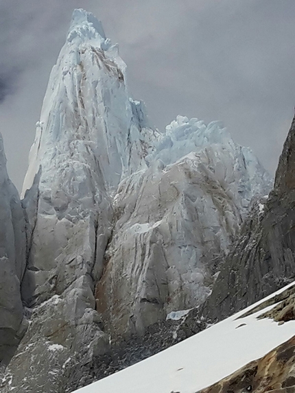 La storia: arrivo a El Chalten a fine dicembre 2017 da solo, qualche giorno dopo mi raggiungono anche Charlie e Panza. Ho meno giorni a disposizione per la salita, a fine gennaio devo volare a Dubai per lavoro mentre loro hanno in programma di restare quaggiù fino al 12 febbraio. Per di più il saccone di Panza col materiale d’arrampicata arriva con una settimana di ritardo: cominciamo bene! Meno male che in Patagonia è semplice trovare dei soci per scalare ed allenarsi, così tra la fine di dicembre e l’inizio di gennaio inganno l’attesa (e lotto col celeberrimo maltempo patagonico d’una stagione che, poi si dirà, è una delle peggiori degli ultimi anni) insieme ad un ragazzo americano: saliamo l’Aguja Guillaumet e l’El Mocho, dove però siamo costretti a calarci prima della fine della via per l’assenza di ghiaccio. Mi basta però per capire cosa significa scalare in Patagonia con il brutto tempo: un esercizio che richiede grandissima forza di volontà, ferrea convinzione sull’obiettivo mirato e anche un po’ di sana fissazione – o follia, forse.