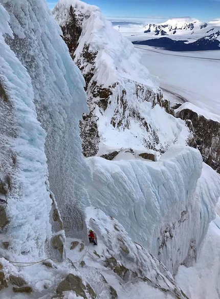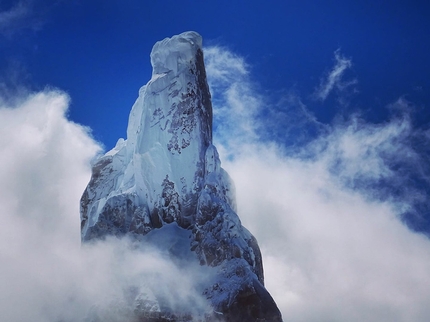 Il mattino successivo il tempo sembra migliore: alle 5 partiamo, il pendio è ghiacciato e dunque Charlie comincia a salire tiri continui da 60 m. In base alle nostre capacità abbiamo deciso di dividere la salita in tre parti: Charlie scalerà da primo la sezione di ghiaccio, io lavorerò dall’Elmo fino alla Headwall nei tiri di misto e Panza (anche in ossequio all’eredità paterna), ci guiderà dalla Headwall fino in vetta. Da questo momento, saranno 33 ore filate di emozioni uniche, tra verticalità incredibili, neve inconsistente, fittoni per sicurezze aleatorie e lunghe sezioni improteggibili, innumerevoli bizzarre conformazioni di ghiaccio aggettanti nel vuoto e sospese sopra le nostre teste che sembrano dover staccarsi ad ogni minimo colpo di vento, un "bivacco creativo" senza materiale da bivacco sotto i funghi sommitali a 40 m dalla cima, un altro tramonto da brividi, un inglese che nell’oscurità mi piomba addosso urlandomi «Stavo morendo!» (recupereremo anche il suo compagno, entrambi sani e salvi), una notte insonne e altre 8 ore di lotta condivisa col ghiaccio (con una sola pala a disposizione), finché alle 14 del 25 gennaio siamo in vetta al Cerro Torre! L’emozione è indescrivibile, ci sentiamo i più forti del mondo, i più "resilienti" e sicuramente anche i più fortunati, per essere in quel magnifico posto e per averlo salito in un solo giorno e mezzo con condizioni tanto estreme. Tutto sotto di noi è piccolo e l’orizzonte sembra ovunque infinito, almeno fino a dove le nubi del prossimo peggioramento già non ingombrano la vista... meglio affrettarsi: ci abbracciamo, scattiamo le foto di vetta e cominciamo subito a preparare le prime calate, abbandonando i fittoni nella neve dei funghi sommitali.