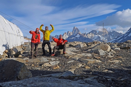 La sera il tempo peggiora e ci costringe a rimanere attendati per due giorni interi. Abbiamo una tenda da due e siamo dentro in tre, facciamo i turni per far che non venga strappata via dalle folate di vento: a rotazione due dormono, uno resta sveglio a tenere il cordino che tiene tutto quanto a terra... se non è "resilienza" questa! Il terzo giorno il tempo dovrebbe migliorare e invece no, tutto come prima, le montagne restano invariabilmente nascoste tra le nubi e il Cerro Torre non si fa neanche vedere. Si perde solo tempo, inutile restare qui: via, si torna a El Chalten – e meno male che ho registrato la traccia dell’andata sul mio GPS, perché il ritorno lungo lo Hielo Continental è un altro patema d’animo, tra raffiche di vento a oltre 100 km/h, neve inconsistente e condizioni di white out totale. Un’esperienza unica! – ma lo diciamo dopo che siamo riapprodati a El Chalten, distrutti dalla fatica.
