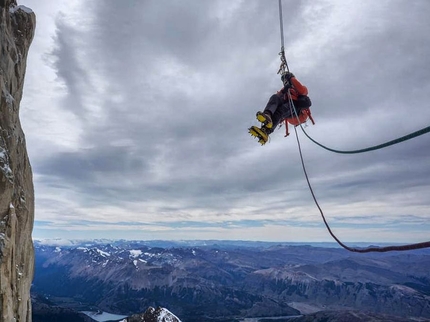 Decideremo per tentare comunque, arrivando in vetta alla luce delle frontali e senza materiale da bivacco. Sugli ultimi tiri ci siamo imbattuti in goulotte tecniche di grado 5, e abbiamo 4 piccozze in 3. Jacopo rompe addirittura un rampone, che Daniel ripara abilmente con un kevlar. Il vento non molla mai, e ci sorbiamo un gelido bivacco "riparati" da un ridicolo muretto di pietre. La mattina successiva si svela il sogno intorno a noi: la catena del Torre, lo Hielo Continental, il Lago Argentino, il Cile…