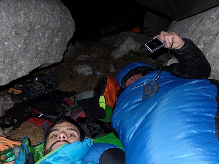 Raggiungiamo faticosamente la base della terza spalla e la scaliamo, scarponi ai piedi, in un misto tra la via di Morandi - Consiglio e la via storica, lungo roccia solida, pulita e ben assolata. Il sole è alto ma trovare un posto da bivacco come quello che abbiamo trovato noi e non fermarsi equivarrebbe a un offesa a chiunque bivacca.
