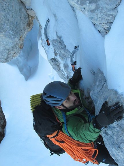 Lungo traverso su neve ripida con la prima spalla tutta sulla nostra testa. Saliamo il lungo camino della via Bonacossa per seguire poi in alto impegnative varianti su roccia pulita mentre un vento freddissimo ci fa rivestire di corsa.
