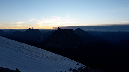 Si sale ancora su rocce e tratti attrezzati fino a giungere al Pian della Tenda, da lì in breve al rifugio Torrani e alle ore 05:30 sono in Vetta, quota 3220m! La croce è lì, davanti a me, il panorama è splendido, sullo sfondo le famose cime delle Dolomiti. Un'alba spettacolare mi dà il buongiorno, lo sguardo a 360° mi ripaga di questa salita impegnativa.