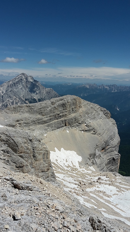 Finita la Cengia mi aspetta la salita tra rocce e detriti fino ad entrare nella conca del nevaio superiore, è da qui che si arriva alla cresta finale fino alla cima. Sono le 13:30 quando arrivo in vetta, quota 3168m. La giornata è fantastica, un cielo terso mi regala una vista spettacolare su tutto il panorama dolomitico. Lo sguardo si fissa sulla vetta del Civetta, il solo pensiero che qualche ora prima ero lassù mi emoziona e mi serra un nodo in gola. Anche la seconda cima è raggiunta!