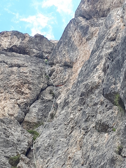 Prima domenica d’agosto. Gruppo del Catinaccio. Lasciamo a Carezza gli amici Leonardo e Andrea. Loro prenderanno la seggiovia. Li aspetta una via con difficoltà che noi possiamo solo sognarci. Proseguiamo ancora er un paio di chilometri. Parcheggiamo e iniziamo a salire i 600 metri di sentiero che ci porteranno all'attacco della nostra via. Sotto a questo muro di roccia, lo sguardo non può che fermarsi sulle placche gialle della “parete rossa”. Tra i molti alpinisti che hanno lasciato un segno su questa parete quella che subito ci passa per la testa è la via di Maestri: arrampicata artificiale, 400 metri, 300 chiodi, 8 giorni.