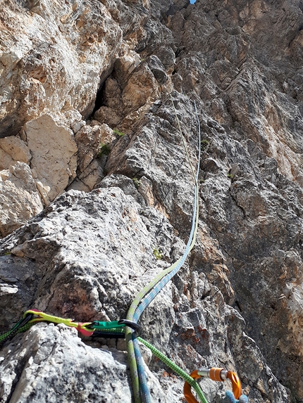 Salire questi spettacolari diedri, cercando la fessura giusta, la misura adatta è stato molto faticoso. Non abbiamo mai avuto così male ai polpacci. A volte, l'equilibrio precario e il nut che non entrava, ci costringeva a rinunciare e cercare un'altra fessura, più in alto. Arrivati alla fine del tiro chiave, abbiamo saltato una bella sosta a chiodi - "chissà chi li ha messi", è stato il nostro primo pensiero - e iniziato ad allestire la nostra sosta. "La più bella che abbia mai realizzato" - ha esclamato Giacomo. Cinque dadi, di cui due tensionati con dei nodi a pacco. Con attenzione è stata messa in tensione, per iniziare a recuperare il compagno.