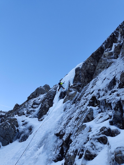 Scaliamo la via fino alla sommità del Ben Nevis, sono circa 250 metri di parete, 6 tiri e un breve tratto in conserva. Le difficoltà si attestano intorno al M6+ abbastanza continuo su tutta la via. Non abbiamo portato a casa nulla di eccessivamente impegnativo, però su quella parete sono riuscito a trovare i tiri di misto più estetici che abbia scalato in tutto questo viaggio. La linea è logica, elegante e le protezioni non sempre banali, soprattutto su un tiro di placca, la quarta lunghezza, solcata da un’esile fessura che ho protetto con un paio di terrier e un friend prima dell’uscita. Abbiamo chiamato questa nuova linea Solar Wind, un piccolo omaggio ai sorprendenti dettagli della vita, come l’Aurora Boreale.