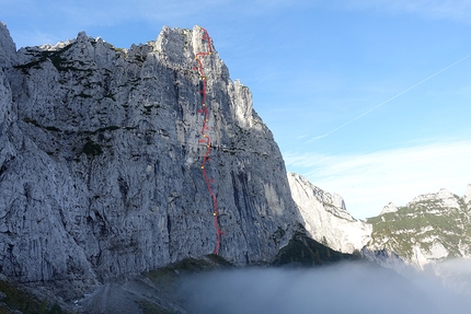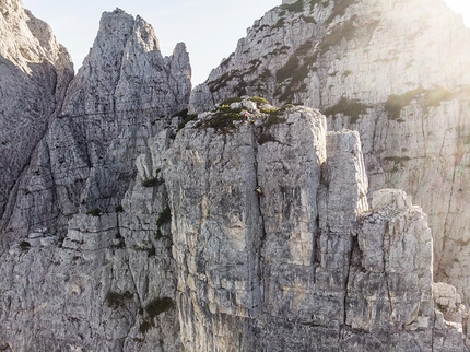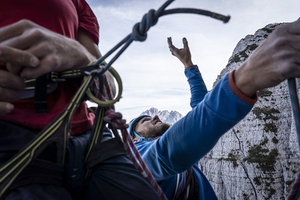 Mi spiega che un paio d’anni prima aveva aperto lì in mezzo una via bellissima assieme a dei suoi compagni di Feltre, Francesco Fent e Alberto Maschi. Una via alpinistica aperta con uno stile moderno, quindi con alcuni spit in qualche sosta e degli spit su un paio di tiri lì dove non è proteggibile, così da renderla più comoda per il rientro e sicura per un’ottica di arrampicata libera. Ad una via aperta in questo stile però non può mancare la libera completa ed è proprio questo che mi propone.