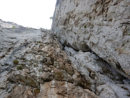 Dopo una breve perlustrazione abbiamo scelto di aprire una via sul lato destro della parete Ovest del Monte Pastello (1128 m in Val d’Adige) dove la roccia è più verticale/strapiombante ma con pochissima erba. Visto che l’idea iniziale era una via alpinistica, abbiamo mantenuto il programma ed abbiamo utilizzato soprattutto protezioni veloci e chiodi. Si è rivelata una bella mini avventura, da cui è nata questa linea in fessura, da cui il nome Pastello Crack.