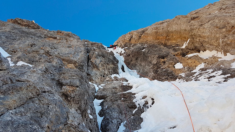 Sulle ali dell’entusiasmo salgo anche il tiro successivo, più facile ma sempre bello, che mi porta ad una cengia dove potremo bere un goccio di te caldo e scambiarci più agevolmente le corde. Qui la parete si incanala maggiormente e diventa una goulotte, parte Aldo che si gode una filata di 60 metri. Qui le difficoltà sono minori e le pareti accanto al ghiaccio e alla neve accettano più volentieri le nostre protezioni veloci. Sosta e via, riparte per un altro lungo tiro chiuso in partenza da un piccolo strapiombo e poi più facilmente su canale di neve.