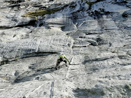 Un’asciugata veloce, magnesite e parto respirando: che emozione essere ancora qui! Ballando sullo sfrigolio della polvere di granito sotto le suole, con i soliti mano-piede che ti alzano nel nulla dei runout, cercando di non ghisarsi i polpacci al primo dei tanti spit rigorosamente messi a mano nella giornata.