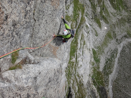 Dall’agognata sosta, optiamo per andare diritti lungo un muro: tocca a me agguantare una splendida dulferaccia, uno spettacolo. I licheni su un granito tormentosamente lavorato non disturbano affatto la scalata.