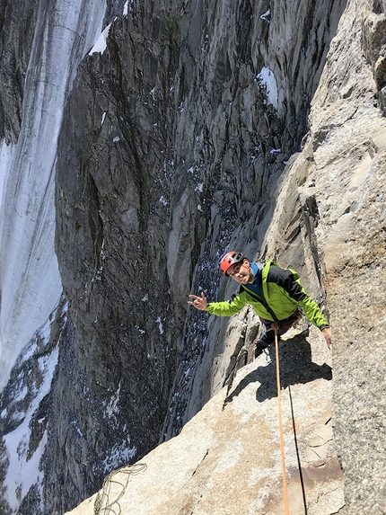 Una linea logica di diedri e fessure che percorre lo scudo, l'unica porzione di roccia sana nel bel mezzo della parete Nord. 350 metri di arrampicata quasi perfetta (l'ultimo tiro era completamente bagnato a causa del nevaio sovrastante) che collega due porzioni di parete un po' più rotta e con difficoltà più alpinistiche però quasi mai su neve. Infatti, noi siamo riusciti a non mettere praticamente mai i ramponi.