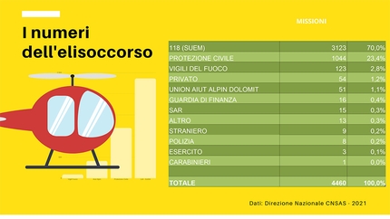 L’impiego del mezzo aereo è stato ancora una volta fondamentale, effettuato soprattutto con gli elicotteri operanti nelle basi operative del SUEM, protagonisti di 3123 missioni di soccorso alpino; in 1044 interventi è stato utilizzato l’elicottero della Protezione civile, principalmente per quanto riguarda la regione Valle d’Aosta e Friuli Venezia Giulia. Il 2,8% delle operazioni sono stati concluse con l’apporto di mezzi dei Vigili del Fuoco, seguiti poi da altri aeromobili dell’Amministrazione pubblica: Guardia di Finanza, Aeronautica Militare, Polizia di Stato, Esercito e Carabinieri.