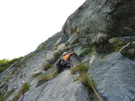 Ad ogni lunghezza sento un po’ di paura entrarmi dentro: se sono dietro, respiro, ma quando tocca a me, trattengo sempre il fiato e arrivo alle soste stabilendo nuovi record di apnea in superficie! Un bellissimo diedro è completamente intasato d’erba: i chiodi scomparsi tra terra e radici... ci sono tanti profumi, la lunghezza della Cipolla, quella all’Aglio, il tiro delle Margherite... un sacco di vegetazione di ogni tipo, e sotto di essa una roccia via via sempre più bella, ma quasi inscalabile!
