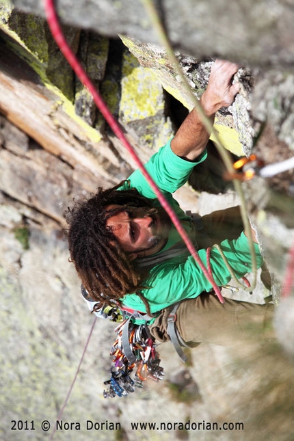 13/8/2011 Non suona la sveglia! È forse un segno? “Cazzio” Nora che non mi ha svegliato, Nora Dorian, la bellissima fotografa. A lei il lavoro più duro: stare nella prima cordata, tirata da Fabrizio Ferrari, appendersi, tirare fuori la “camera” (che è da accudire come un bebè) e scattare lasciandomi scalare. Sì, io devo scalare, sto provando la “graund-up”, da sotto a sopra, tutto da primo, in libera e fino in cima. E cosa sarà mai liberare dei 6b e 6c direte voi?