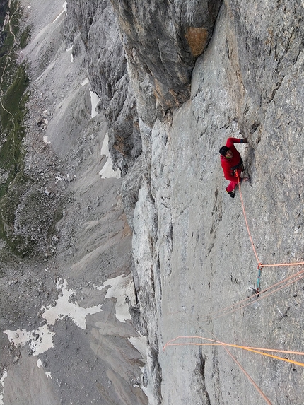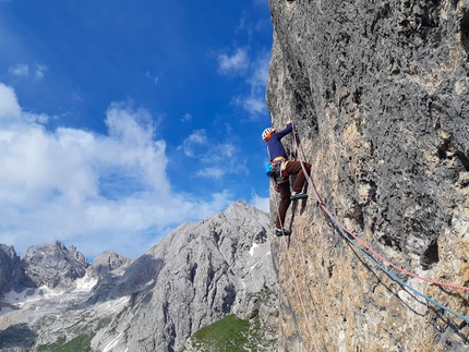 Enzo Oddo, dieci anni fa l’enfant prodige dell’arrampicata sportiva francese, e Léo Billon hanno concluso uno di quei velocissimi raid nelle Dolomiti che lasceranno il segno. Oddo ha scaldato i motori insieme a Silvia Loreggian ripetendo Gigi La Trottola sul Mulaz e Muro Giallo in Tre Cime di Lavaredo, poi con l’arrivo di Billon il trio si è spostato in Marmolada dove ha ripetuto a-vista Specchio di Sara con la variante iniziale di Coitus Interruptus (7c+ max, 350m). Dopo una notte al bivacco Dal Bianco, il trio ha ripetuto a-vista la celebre Larcher-Vigiani (8a max, 500m).