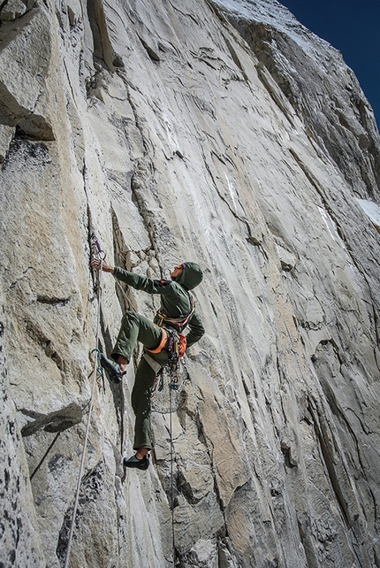 Considerando che per attaccare la parete i ragazzi partono alle 5 e io mi sveglio con loro alle 4.15, mi tocca passare un bel po' di ore in tenda, da sola, ad aspettare e congelare. O in alternativa, a star fuori e tremare per fare qualche ripresa o fotografare. C'è di buono che la maggior parte delle volte, quando verso mezzogiorno, recuperata la sensibilità di mani e piedi, mi appresto a tornare al campo base, intravvedo Jamir (il nostro ufficiale di collegamento) e Dinesh (il cuoco) intenti a raggiungermi, curiosi di vedere come funziona questa cosa dell'apertura di una nuova via su un'impressionante parete ancora inviolata.... Mi portano anche dell'ottimo pane alla patata (Aloo Parantha), non piccante, come pranzo al sacco, ritenendo che le nostre barrette e la nostra polenta istantanea non possano considerarsi degne fonti di nutrimento. Concordo!