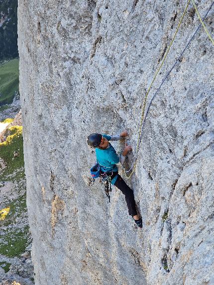 "Io la volevo chiamare Sambuco” scherza Massimo Faletti, che prosegue spiegando come la caratteristica peculiare della Marmolada siano proprio i buchi: anche se difficili da raggiungere, ce ne sono. "Il Pesce della celebre via omonima lo dimostra. Ma nel nostro settore non si trovavano più buchi, soprattutto nelle lunghezze centrali. A risolverci il problema, è arrivata Iris.”