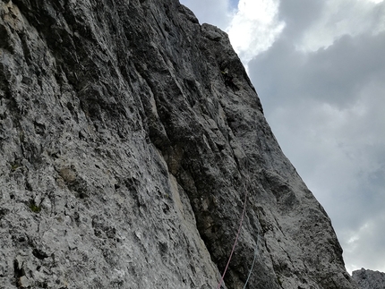 La via segue un sequenza di fessure e belle placche a buchi puntando a un’evidente tetto a mezzaluna a circa metà parete, qui incrocia per una lunghezza e mezza la Massarotto del 1992 per poi continuare con linea indipendente. Offre delle lunghezze molto belle su placche a buchi e la roccia è ottima su tutto il percorso, in particolare nel diedro del secondo tiro e nella spettacolare sesta lunghezza. Sono stati lasciati sette chiodi e un cordino, per una ripetizione portare doppia serie di friend fino al 2 BD e un 3, diversi cordini e alcuni chiodi.