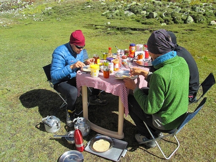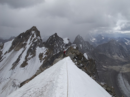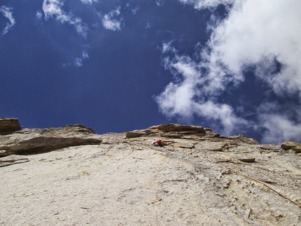 Con questo preciso obiettivo nella testa siamo saliti a piedi fino a Takdung, nonostante il tempo fosse in peggioramento. Alcuni giorni di attesa, poi ci siamo svegliati durante una notte limpida ed abbiamo iniziato l'avvicinamento alla Lotus Tower. Dopo alcuni iniziali semplici tiri, il granito ci ha offerto delle perfette fessure d'incastro favorendo una bellissima arrampicata su placca. Quando abbiamo raggiunto la cima il tempo stava peggiorando rapidamente. Abbiamo affrontato la discesa in doppia sotto un pesante scroscio di pioggia e neve ma eravamo più che felici di essere riusciti ad approfittare di questa breve opportunità. Abbiamo chiamato la via Splitter and Storm, (500m, TD 6a). La sera nelle nostre tende stavamo già pensando alle nuove salite da fare nei giorni successivi.