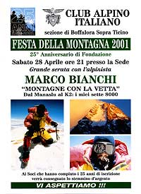 Il 28/04 presso la sede del CAI di Boffalora per il 25° anniversario della Sezione si terrà un incontro con Marco Bianchi, l'alpinista milanese salito in vetta a 7 ottomila.