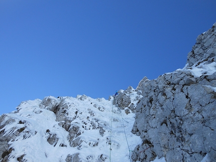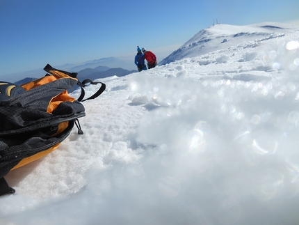 Giornata tersa, sole, temperatura giusta per l'alpinismo. Agnese mi conosce da tanto, ma non sa cosa voglio salire… Da lontano le indico la linea, lei mi risponde che le avrebbero fatto comodo dei bastoncini. Ok se pensa ai bastoncini vuol dire che non si è intimorita… credo; ci concentriamo sui preparativi del materiale, mi aiuterà a portare il trapano. Ops... sì, “trapano”, parola scomoda per alcuni. Forse a due passi da una stazione sciistica con tanto di comprensorio residenziale anni ’80 (orrendo, questo sì), avere due spit alle soste si può fare. Oppure ragionando in termini di proteggibilità: sul Matese è cosa ben risaputa che lungo i tiri è difficile farlo, che bisogna inventarsi metodi bizzarri che spesso sono un mero conforto per la psiche. Inoltre è opinione condivisa dai principali alpinisti che si sono cimentati con aperture qui. Non in ultimo ritengo che sia giusto salvaguardare il più possibile almeno la sicurezza del secondo di cordata. Per questi motivi cerco, se posso, di attrezzare le soste di vie di una certa difficoltà con fix.