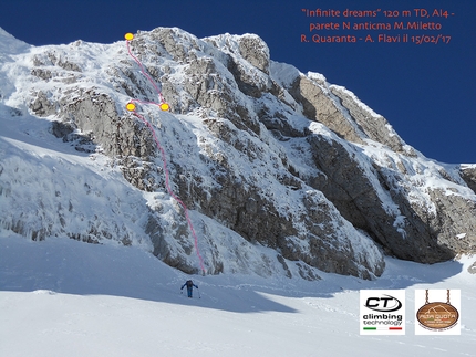 Sì, lo ammetto, è una malattia. Non può che essere una malattia quel tarlo che ti conduce a tornare di tanto in tanto, ma con costanza, al pensiero di una linea da aprire. Infinite dreams nasce da uno di quei tarli, da quando insieme a Fabio e Gabriele aprimmo l’anno scorso la variante alla via The thin ice sul Monte Miletto. Osservammo quella linea inizialmente ben corazzata di ghiaccio ma che poi si faceva sempre più esile. Forse giustamente pensai che non era quello il giorno giusto e ci dedicammo appunto a quella che è diventata poi la variante Comunque andare