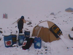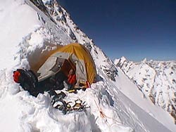 | K2 (8611m) Dopo il tentativo all'Ogre, Hans Kammerlander si è trasferito al K2, dove si è unito al team Focus che, tra gli altri, include il tedesco Peter Guggemos, il francese Jean Christophe Lafaille e lo spagnolo Pepe Garces. Qui Kammerlander tenterà di chiudere i suoi conti con la montagna che lo ha visto già due volte tentare la salita, e rinunciare a poche centinaia di metri dalla cima. Jean-Christophe Lafaille giunto al campo base (5100m) il 19 giugno, nonostante la meteo finora quasi sempre al brutto, ha già iniziato il suo programma di acclimatamento. Jean-Christophe, il 21/06, ha effettuato infatti una puntata lungo la via Cesen fino a 5950/6000m, a cui è seguito il pernottamento al campo 1 che, come un nido daquila, domina il ghiacciaio dalla cima di uno sperone roccioso alto 900m. Il 26/06 è ripartito per passare altre quattro notti in quota; due a 6000m e due a 6800m. Poi il 30/06 é salito fino a 7200m sulla "eccezionalmente bella" via Cesen, prima di ridiscendere al campo base. Ora il morale è buono e il tempo, rimasto piuttosto brutto fino a metà della settimana scorsa, sembra essere migliorato ed aver dato il via alle salite delle spedizioni presenti. Trango Il team del brasiliano Waldemar Niclevicz (spedizione Focus) è impegnato nella parte superiore della Nameless Tower, dove in questi giorni vengono fissate le ultime corde fisse prima di tentare il balzo finale in vetta. Anche gli alpinisti sudamericani hanno dovuto confrontarsi, ovviamente, con un tempo decisamente brutto che li ha tenuti fermi per diversi giorni. Ma il peggio sembra ora passato . Verrà fissato un ultimo campo in parete a quota 5.900 metri e di lì verrà tentata la vetta, 6.251 metri. di Manuel Lugli Informazioni: Manuel Lugli www.focusworldexpeditions.com | ![]() Il Campo II di Jean-Christophe Lafaille a 6800m ![]() Jean-Christophe Lafaille al campo base del K2. La sua spedizione è anche seguita dal sito ufficiale www.jclafaille.com Altre info su PlanetMountain.com: Jean-Christophe Lafaille Hans Kammerlander |