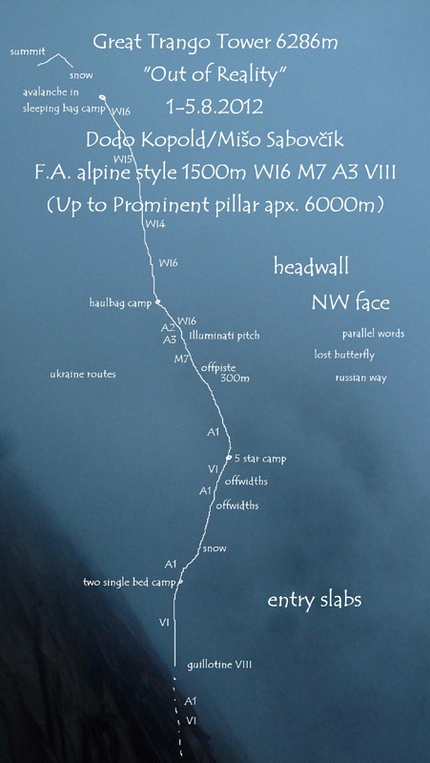 Great Trango parete Nordovest: Out of reality 1500m WI6 M7 A3 VIII (1-5.8.2012 stile alpino)