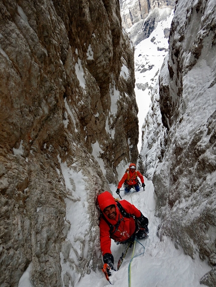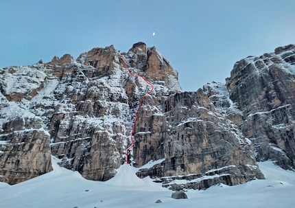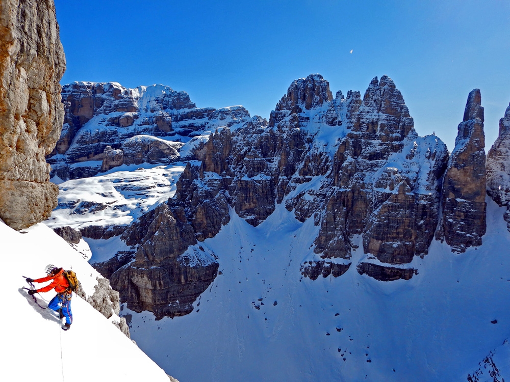 Approfittando di questo inaspettato regalo, Emanuele Andreozzi, Matteo Faletti e Santiago Padrós hanno ora aperto una nuova via sulla parete Nord-Nord/Est della Cima Tosa che, nella veste invernale, ricalca nella parte bassa la Castiglioni-Detassis, poi a circa metà parete traversa verso sinistra ed incrocia la Via Piaz e poi esce dritta per l’enorme camino. Le difficoltà stimate sono attorno a AI 6 e M7 per, come racconta Andreozzi su Facebook, "mille metri di goulotte così non basta una vita per sognarli."