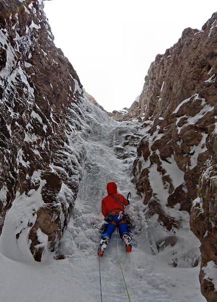 Per quanto riguarda i primi dettagli della linea ora chiamata Pazzione Primavernale, Andreozzi spiega "Verso le due del mattino di giovedì 20 maggio siamo partiti dalle nostre tende e una mezz'oretta dopo abbiamo attaccato la via alla luce delle frontali. Dentro l'impeccabile goulotte si susseguono un tiro dopo l’altro su ripido Alpin Ice, l’arrampicata è da sogno, ma impegno ed ingaggio sono alti. Il il nevaio della parte centrale ci concede una breve tregua prima di entrare nell’enorme camino della parte alta, dove la scalata torna ad essere dura. Sbuchiamo sul grande pianoro sommitale dopo 19 tiri e sedici ore e mezza di arrampicata in parete."