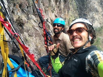Abbiamo iniziato l'avvicinamento nel pomeriggio dell' 8 aprile raggiungendo la base della parete dopo una camminata di 6 ore e un bivacco lungo il sentiero. Il 9 aprile Tiny ed io abbiamo aperto il primo tiro mentre Oscar trasportava l'acqua dal fiume, situato a circa 80 metri sotto l'inizio della nostra via (alcuni tratti della parete partono direttamente a livello dell'acqua). Abbiamo fissato i primi tre tiri (uno di 5.10 e due di A4) e ben presto ci siamo resi conto che l'arrampicata sulla parte bassa della via sarebbe stata lenta e difficile, quindi abbiamo deciso di portare cibo e acqua per 15 giorni. 84 litri di acqua... I nostri haulbags pesavano 120 kg!