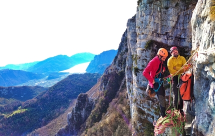 Avevo scelto Riccardo Russo, amico calabrese ormai trapiantato ad Arco,: lui era l'elemento giusto per una spedizione dal clima goliardico, che però aveva l'ambizione di arrivare finalmente in cima al tanto agognato pilastro. L'approccio seppur alleggerito dalla ripartizione dei carichi si è rivelato comunque lento, e ci aveva fatto capire che era inutile: sul pilastro Alma non si corre! Era il 5 novembre 2022 e abbiamo trascorso la nottata ben coperti nel "Hotel al sole", come avevo battezzato il bivacco nella nicchia-terrazzo con splendida vista sul lago di Garda. Ci siamo svegliati baciati effettivamente dal sole, in una tersa mattinata novembrina. Facendo scorrere due tiri di corda abbiamo ripreso l’apertura delle nuove lunghezze da dove eravamo arrivati con Claudio due settimane prima.