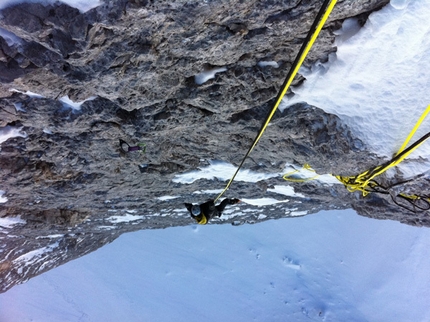 Alle 8.00 circa erano all'attacco, quindi l'arrampicata è filata sorprendentemente liscia lungo i primi 6 tiri che contengono le maggior difficoltà tecniche della via. Dal settimo tiro però Gietl e Schäli hanno incontrato difficoltà maggiori, visto che la parete diventa meno ripida. Così hanno dovuto affrontare neve, ghiaccio e anche protezioni più distanti. Alla fine i due hanno raggiunto la cengia verso le 14:45 e poi si sono calati lungo la via.