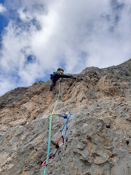 Nelle giornate di apertura il tempo è sempre stato inclemente ma questo non ci ha scoraggiati! La via è stata aperta dal basso e ci sono volute in tutto quattro giornate di lavoro per salire, attrezzare e pulire le lunghezze che sfruttano una linea bella e logica, che asseconda le caratteristiche della parete: fessure, placche a buchi e nella parte terminale anche un bel camino tecnico e ciliegina sulla torta, il tiro finale.