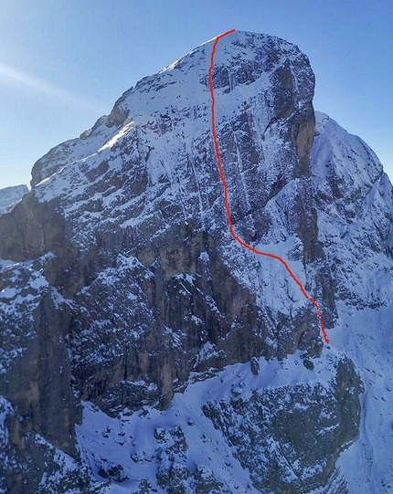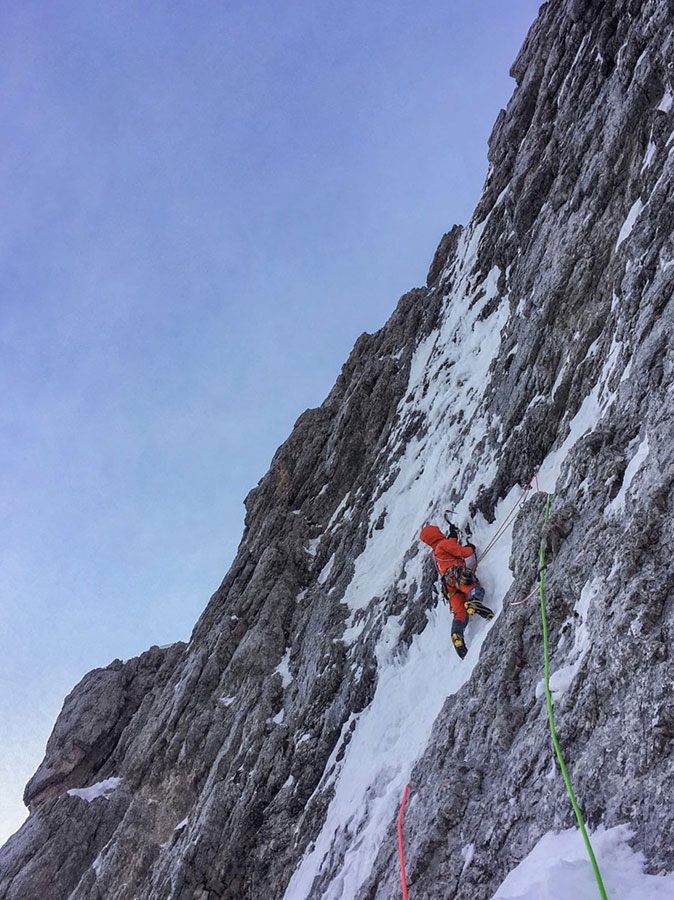 Per proteggere la via i due hanno usato chiodi da ghiaccio, nuts e friends, e hanno piantato 5 chiodi da roccia, esclusivamente alle soste. Dopo i circa 200 metri della lingua di ghiaccio Gietl e Oberlechner hanno arrampicato nuovamente in conserva, seguendo l’evidente goulotte e poi la cresta per arrivare in cima alle 11:50. I due sono scesi lungo la via normale estiva che, carica di neve, ha richiesta cautela.