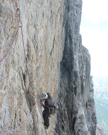 Con un ultimo tentativo prima dell’arrivo dell’autunno, risaliamo con le jumar le corde fisse che abbiamo lasciato dentro al diedro, non mancano momenti di panico dovuti allo sfregare delle corde su delle lame acuminate. Le placche grigie, sopra il grande diedro giallo, si rivelano meno ardue di quanto ipotizzato; la roccia è diametralmente opposta rispetto a quella del grande diedro, ottima e molto lavorata con varie clessidre. Due tiri di V e uno di VII, quest’ultimo da me affrontato più con foga che cervello, ci portano alle placconate a sinistra della via dei Sud Tirolesi, dove passano delle varianti di collegamento tra la via del Cuore e la Sud Tirolesi.